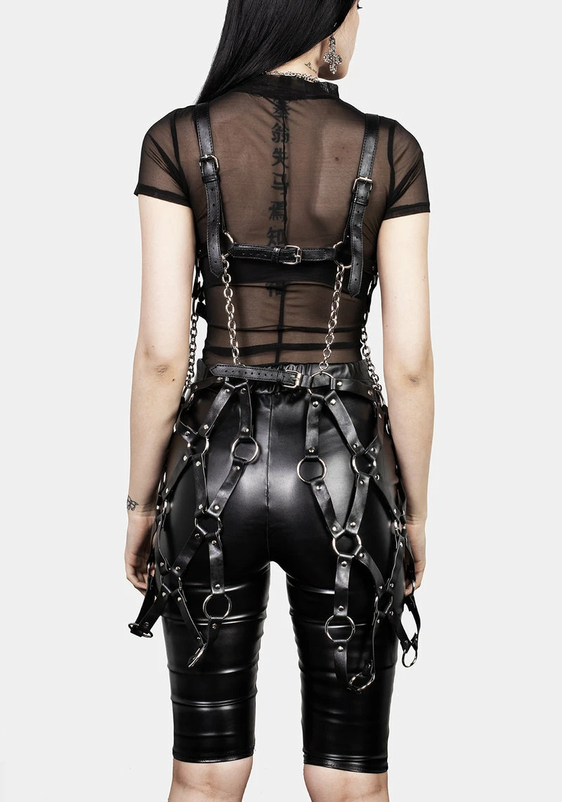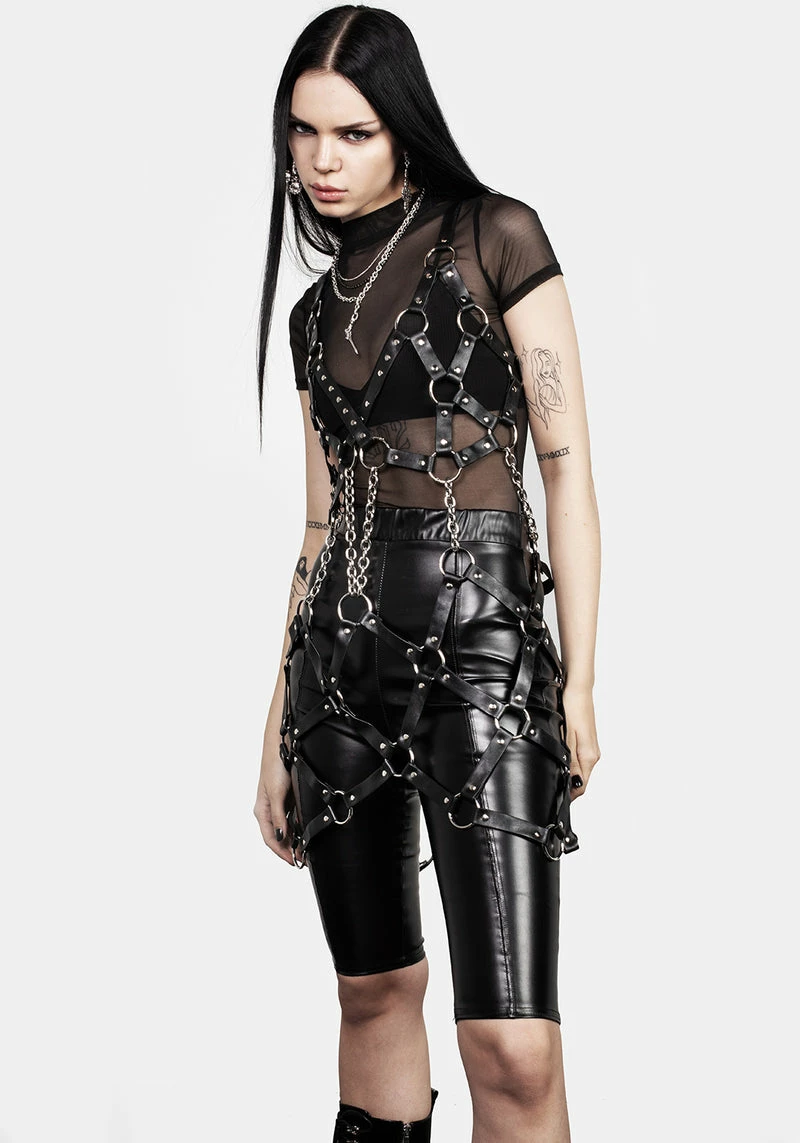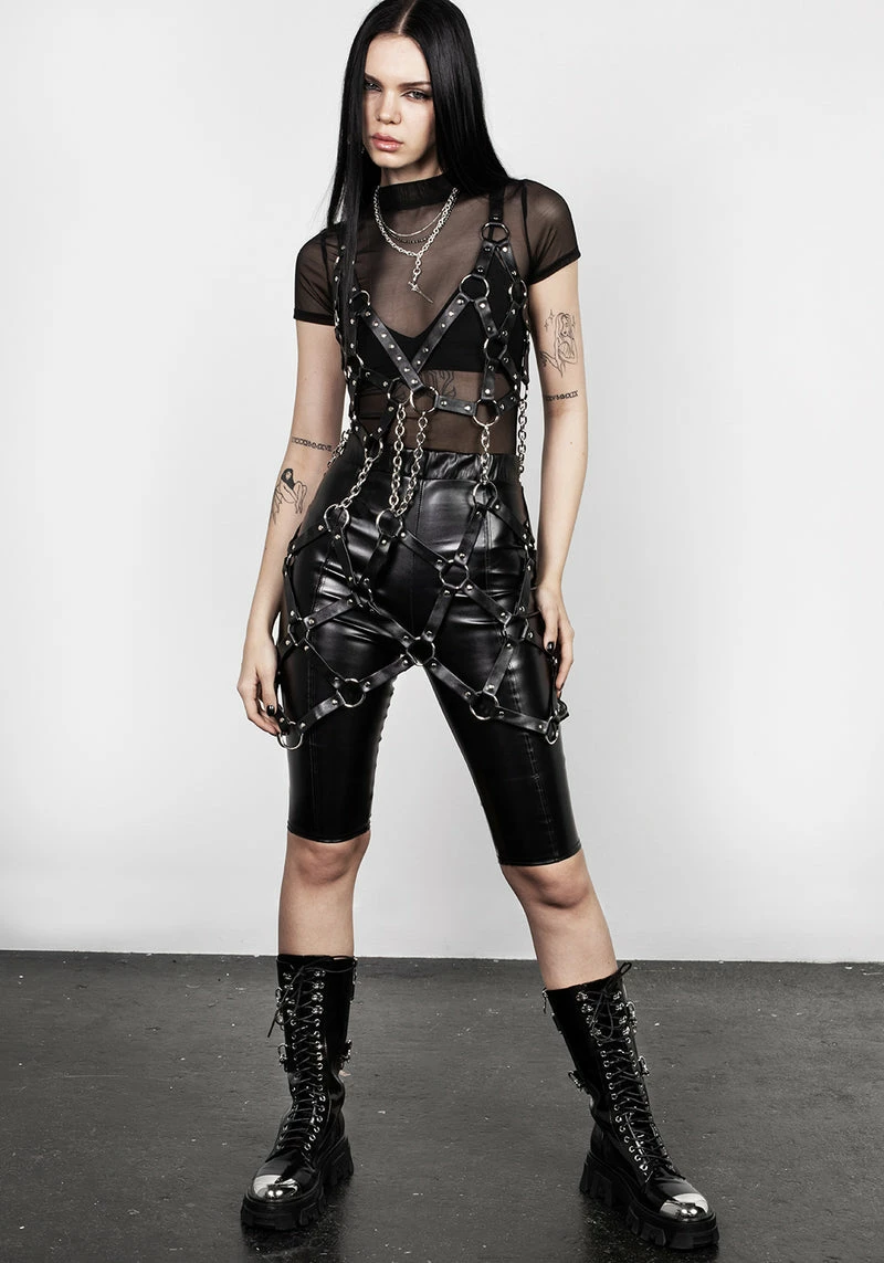 ✦ Diamond shapes created with faux leather straps and silver O-rings to a body-conscious fit