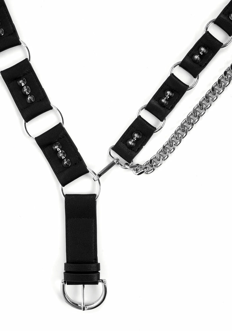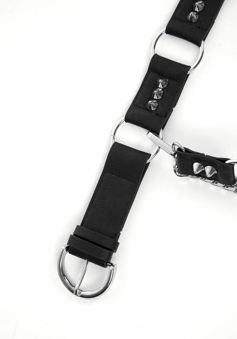 ✦ Faux leather strips linked with sturdy silver O-rings and studded embellishments